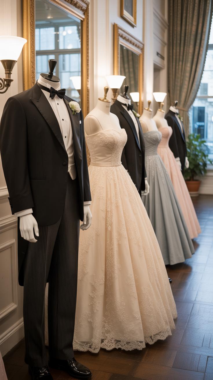 Try integrating color accents like a deep burgundy tie or emerald cufflinks. These add personality but keep your look classic. You might also opt for fabrics with subtle patterns, such as a tuxedo with a faint windowpane or a gown with lace in unexpected spots.