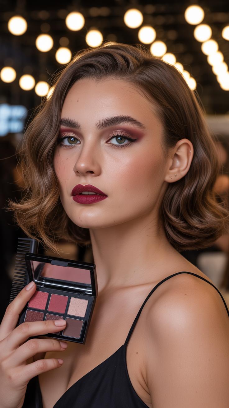 Choose makeup colors that brighten your features but don’t compete with fuchsia. Soft peaches, warm nudes, and light browns work well for eyeshadow. They add warmth without clashing with the pink-purple shade.