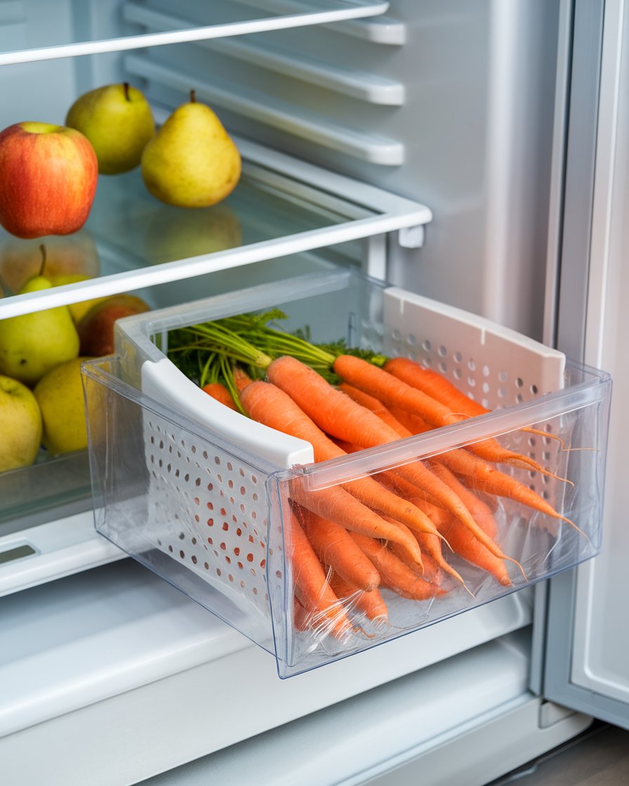 - Storing carrots in a perforated plastic bag in the crisper drawer of the refrigerator helps maintain their crispness.