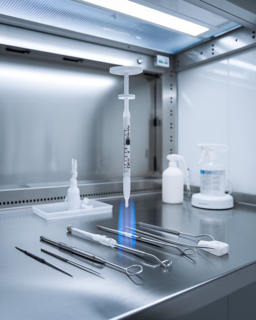 - Flame sterilization of the syringe tip before use is essential to eliminate contaminants and maintain a sterile environment.