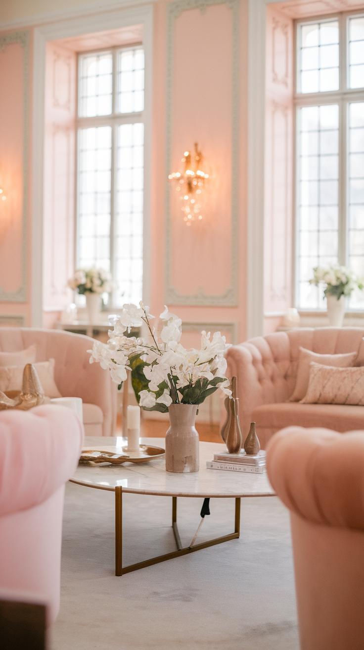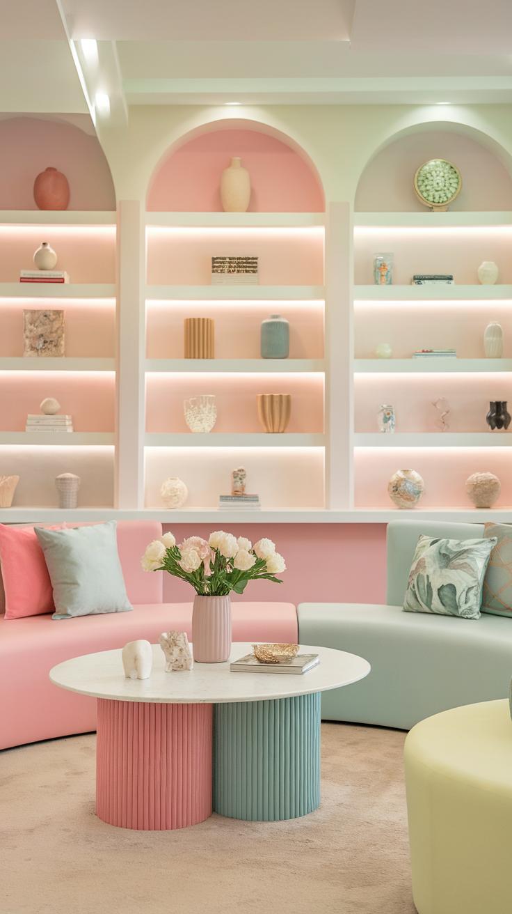 Arrange furniture to encourage conversation and warmth. Place sofas and chairs in a circular setup, and add a coffee table at the center to invite gathering. Layer in elements like floating shelves showcasing pastel decor and vibrant greenery for extra life. Complete the look with soft lighting from elegant lamps or string lights. Incorporating these elements helps create a soft and elegant ambiance, perfect for relaxing or entertaining.