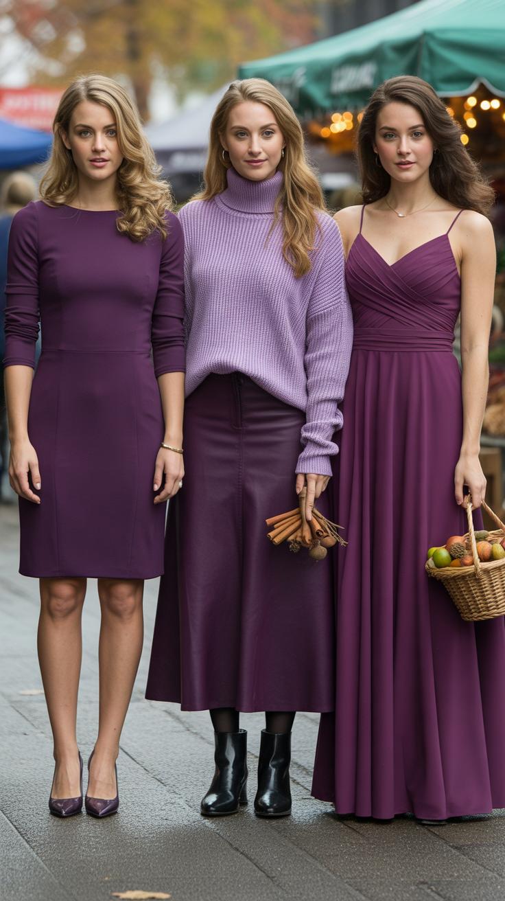 Choosing trendy textures like velvet or satin works well with plum. They add depth and richness that feel current but still elegant. Think about mixing patterns subtly, such as pairing a plum dress with a plaid scarf that has autumn tones. How can you mix your wardrobe staples with seasonal trends? Try to keep your dress cut clean and classic, so your outfit stays polished no matter what trends you include.