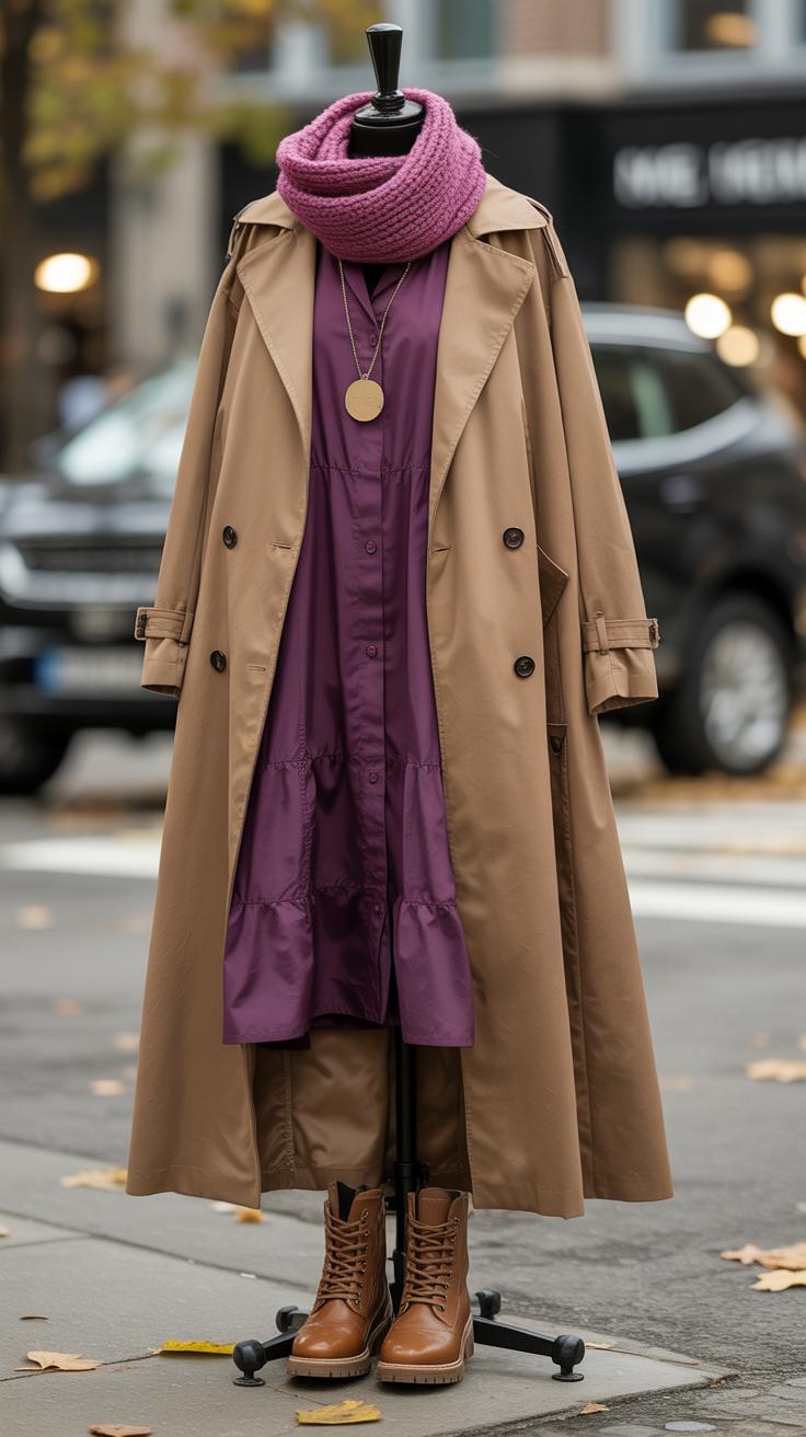Picking the right outerwear color can make a big difference. Camel coats add warmth and brighten plum dresses with their neutral but rich tone. This combination keeps your look classic and versatile. Grey coats offer a soft contrast that feels understated and modern without competing with the dress’s deep shade.