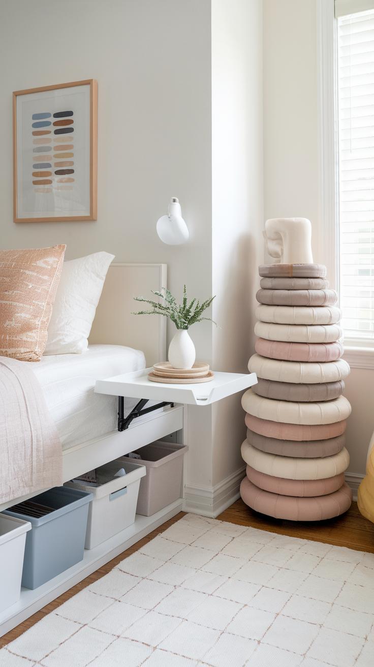 Walls can hold more than just decorations. Install shelves or hanging organizers on unused wall space to keep essentials within reach. Under-bed storage is great for things you don’t need daily but want nearby.