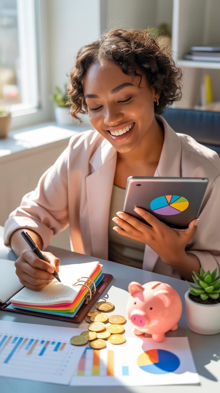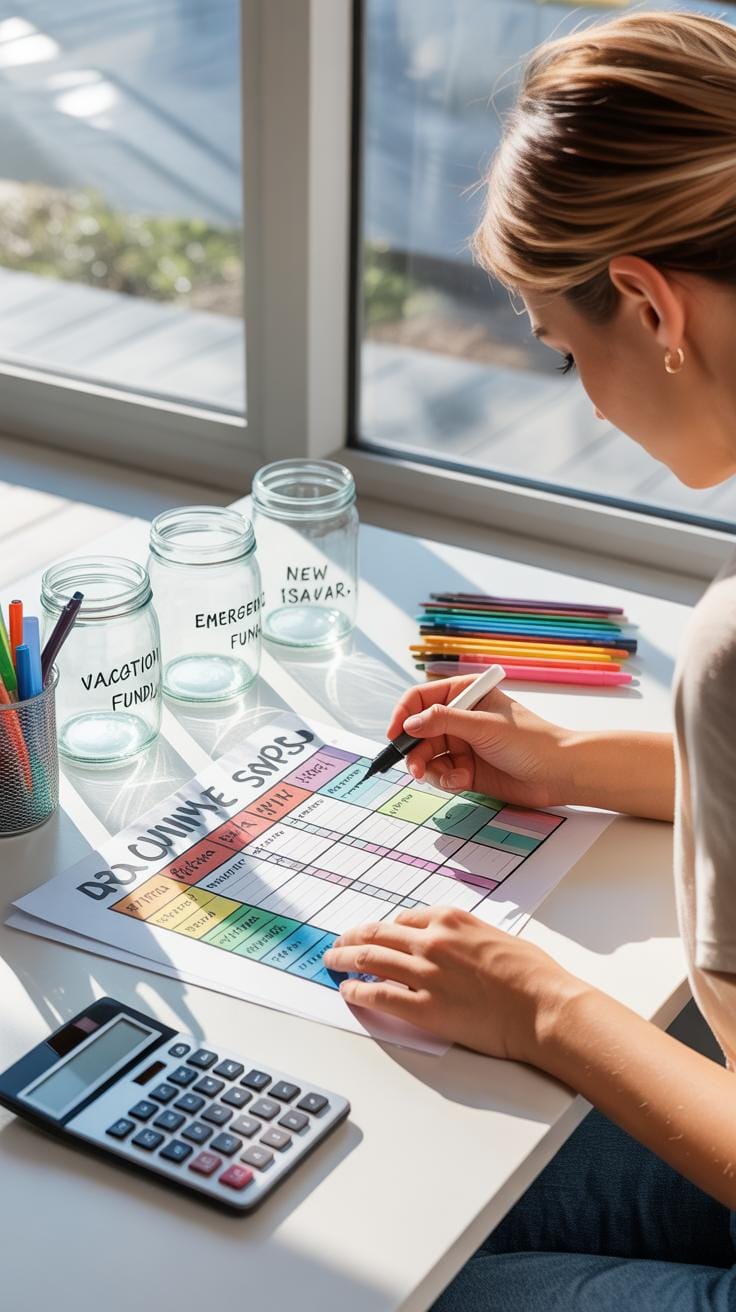 Next, choose how you want to track your progress. Maybe a savings chart suits you, where you mark milestones visually. It’s surprising how some charts can motivate you without overwhelming. Pick saving methods that match your lifestyle—automated transfers, cash envelopes, or apps. Each method feels different, so pick what you’re likely to stick with.