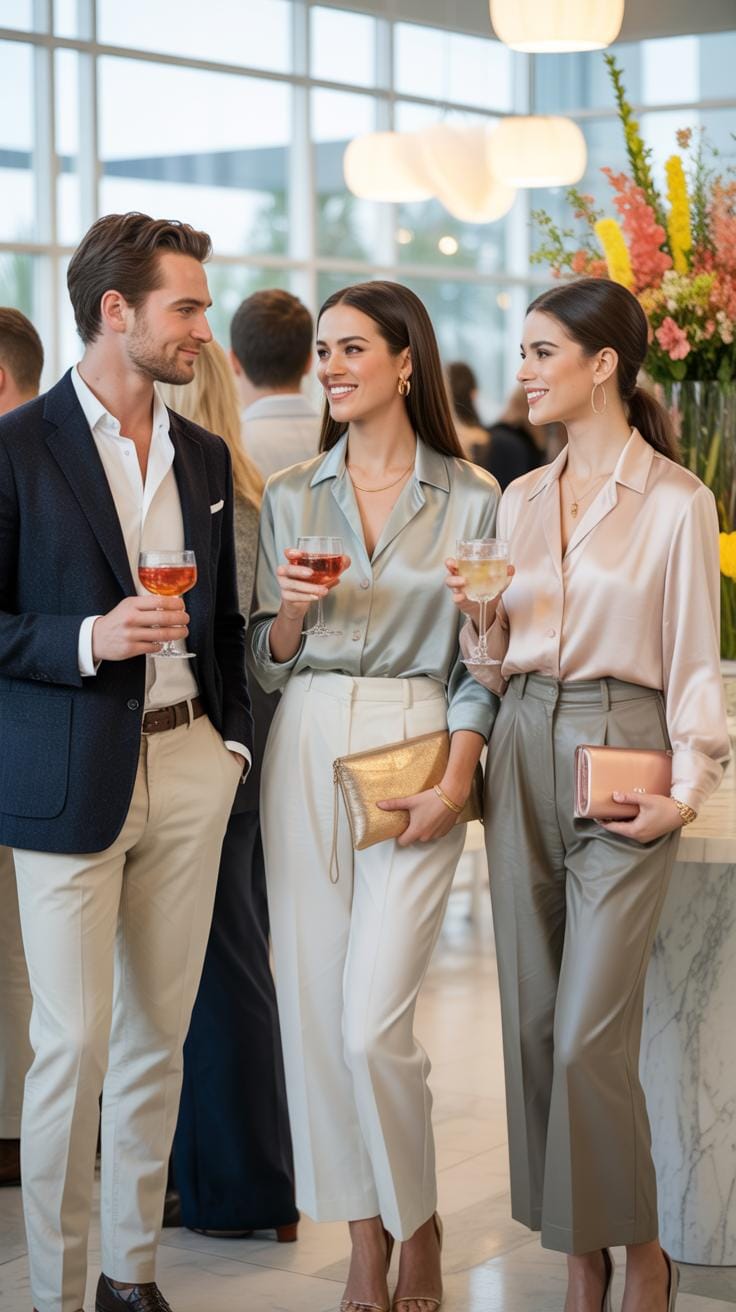 Building subtle cocktail attire through separates offers creative flexibility while maintaining sophisticated coherence. A silk blouse paired with structured trousers creates a refined semi-formal aesthetic that challenges traditional cocktail dress conventions. This approach allows for personalized styling while maintaining the polished appearance expected at elevated social gatherings. The interplay between luxurious fabrics and tailored silhouettes achieves understated elegance that feels both contemporary and timeless, proving that separates can deliver the same impact as a traditional dress.