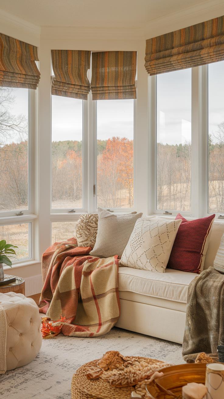 For autumn, use rich colors and cozy décor to embrace the season. Add throw blankets and comfy seating to invite relaxation as you enjoy the changing leaves outside. Using insulation on windows prevents drafts while keeping warmth inside.