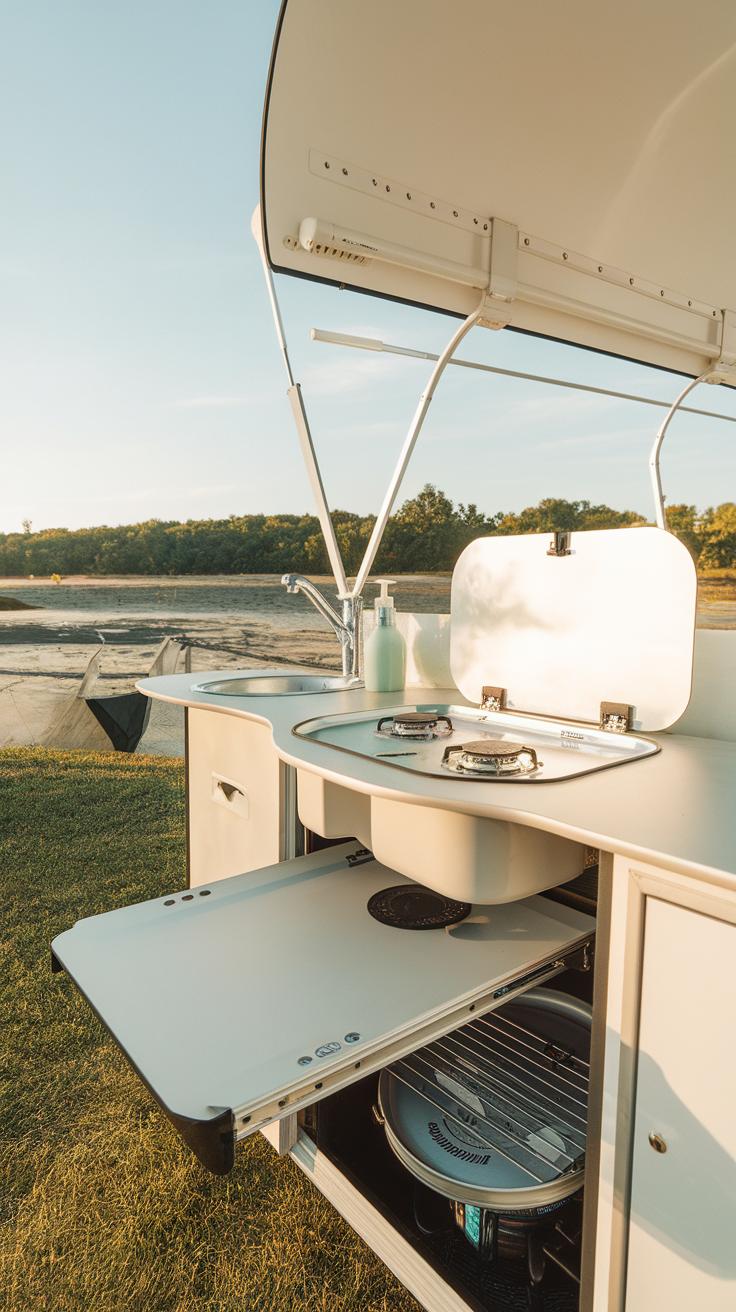 Thoughtful storage is key. Use drawers and shelves that fit your tools and food without crowding the space. A secure water supply system, like a built-in tank with a small pump, ensures you have water on demand for cooking and cleaning.