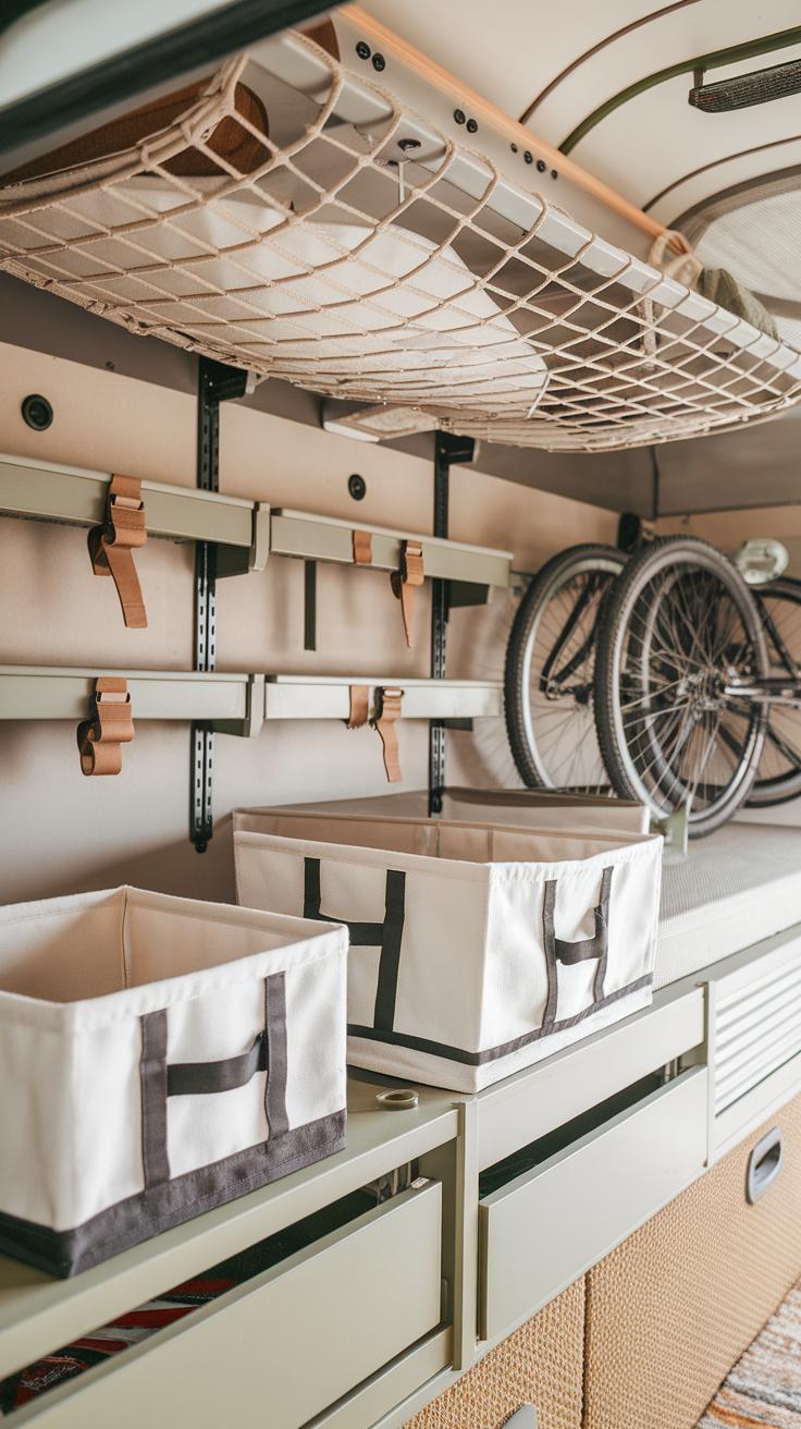 Wall-mounted shelves free up floor space and keep essentials visible. You can install low-profile brackets that support lightweight containers. Hanging nets work well near sleeping or cooking areas to hold frequently grabbed items. Ceiling racks are perfect for bulky items you don’t need every day, like camping gear or extra blankets.